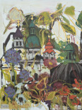 Ein abstraktes, farbenfrohes Gemälde mit Kuppeln und Türmen als moderne Interpretation von Salzburg. Dynamische Pinselstriche und leuchtende Farben erinnern an die Stimmung des Salzburger Ruperti Kirchtag. (Startbild oben)